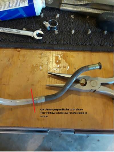 Ok the actual install – Remove the old master cylinder (see below) Be sure to note which one goes in which hole. You may even want to label. Attach the nipples to the Master cylinder (the aluminum ones provided. Assure they are tightened to the point they are snug. You can loosen the clamp on the reservoir to allow the tubes to slide down 6 inches or so. You will need to make a perpendicular cut to the plastic hose. Just right above the metal tube.